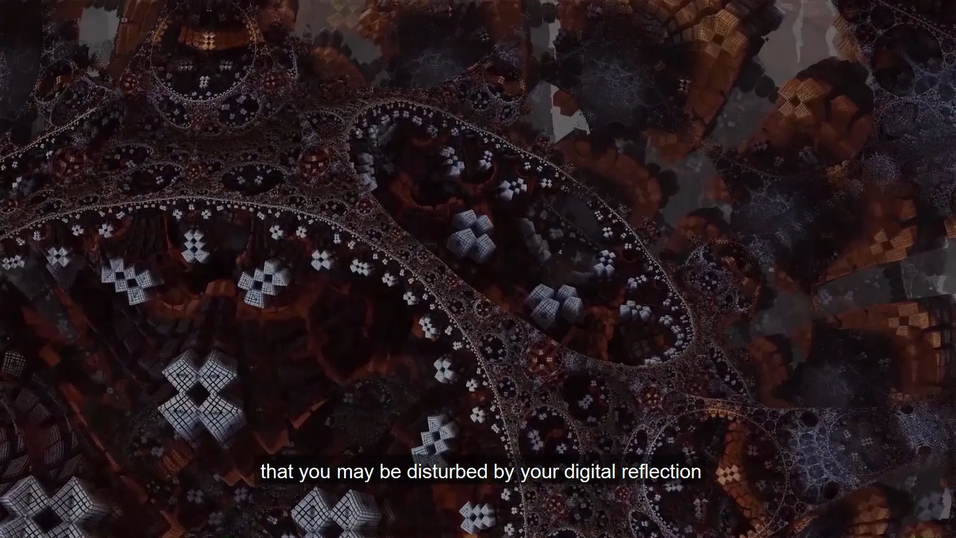 Visuals from the poem along with one of the lines from it subtitled in English — Visual from the poem and the line "that you may be disturbed by your digital reflection" as subtitle