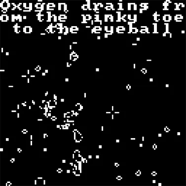 Screenshot of Binary — Screenshot of the work, white text is generated at the top of a black pixellated game screen.