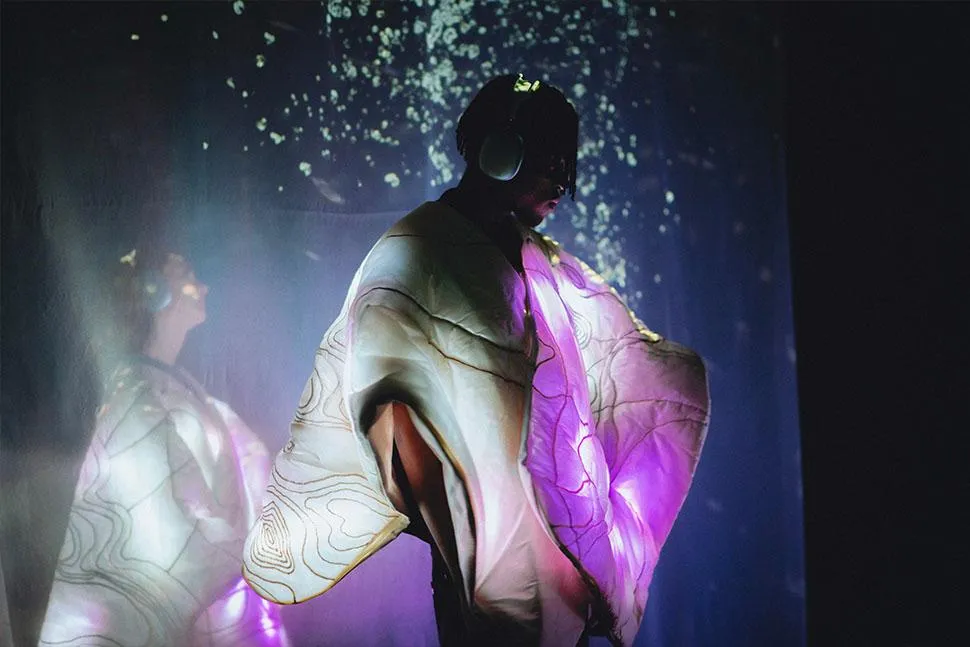 screenshot of work, showing two people dancing with VR headsets and quilts