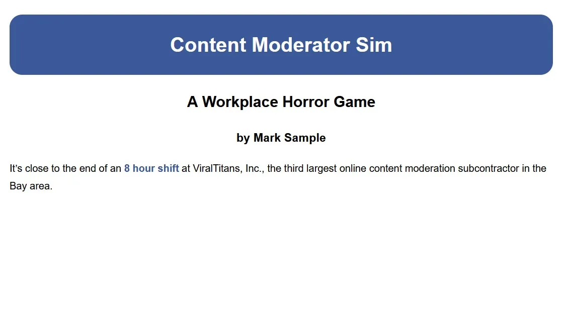 Screenshot of "Content Moderator Sim" opening splash screen — Opening screen: Title displayed in white text on a Facebook blue banner, author listed below.