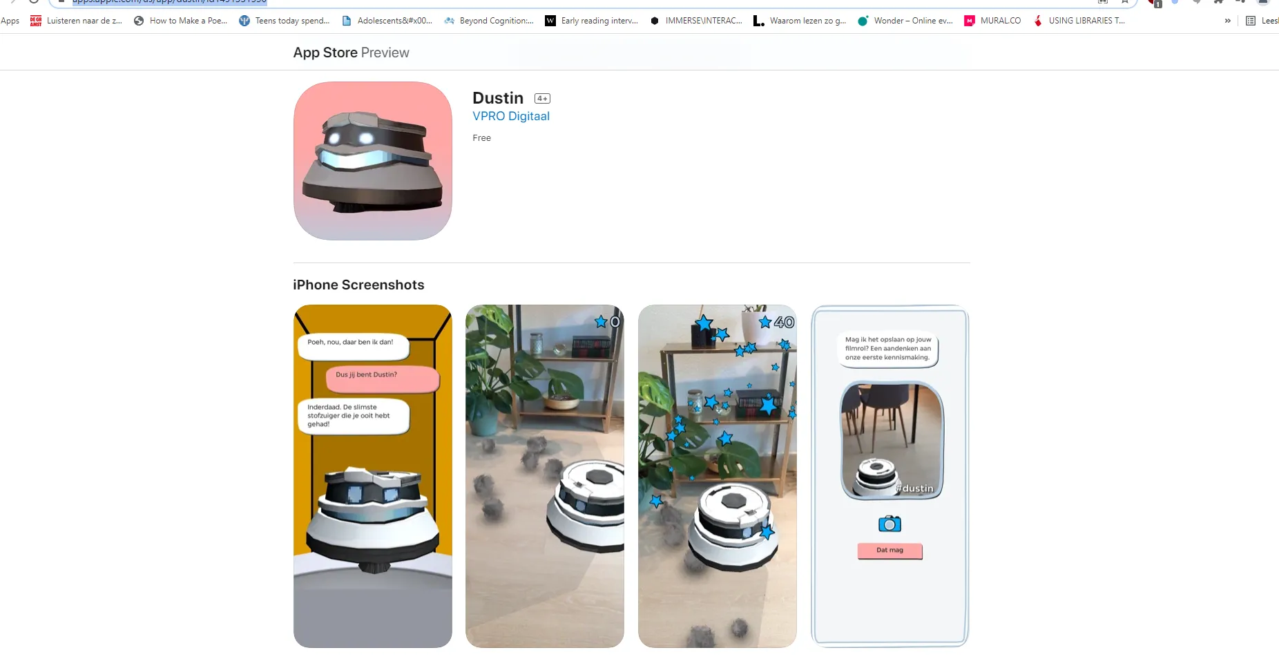 Screenshot of the Dustin iOS store download page — Screenshot of the iOS store download page, showing screenshots of the app and Dustin's face.