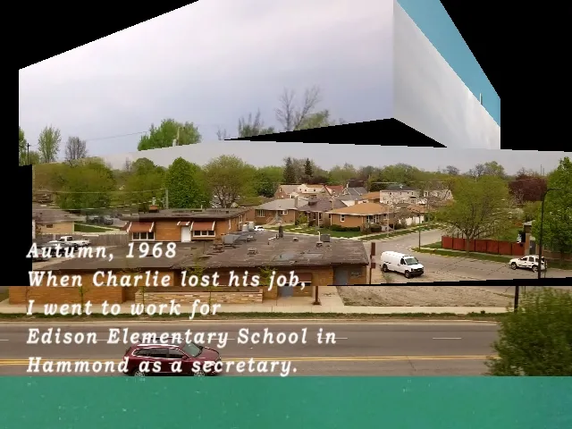 Screenshot of "Legends of Michigami" — Series of cuboids, rotating, with sections of a street split across them, poetry overlaid in white.