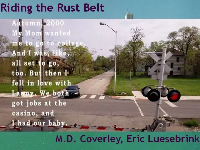 Screenshots of "Legends of Michigami" — A photograph of a junction on an American road, with a white poem scrolling vertically up the page.
