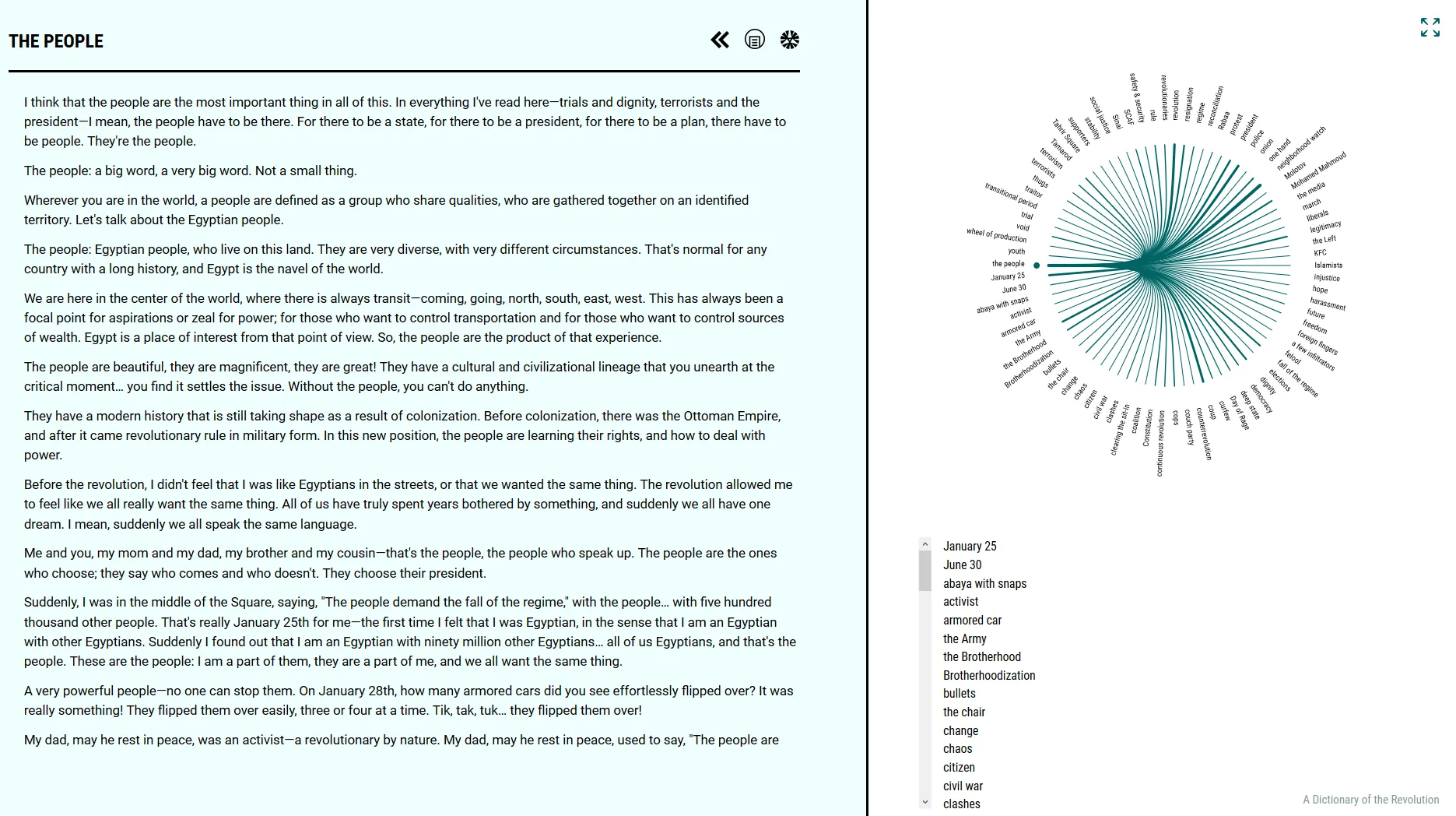 Screenshot of 'A Dictionary of the Revolution' — Screenshot of work with the term 'the people'; text is displayed to the right in a blue modal menu.