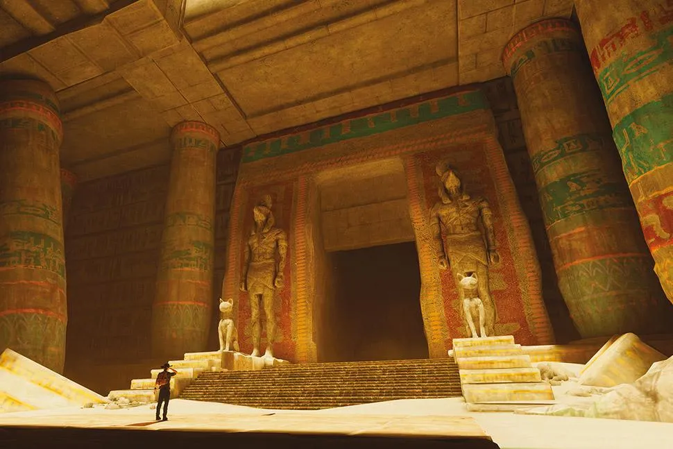 screenshot of game, showing a small figure standing in front of a large ruin gate