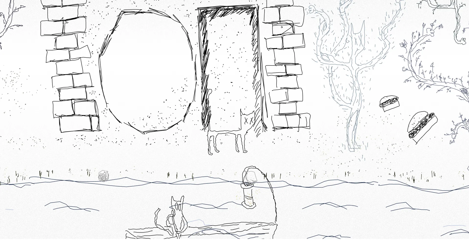 A screenshot of "Garden" — A screenshot of the work: Cat-like creatures and plants, with burgers, in a sketched environment.