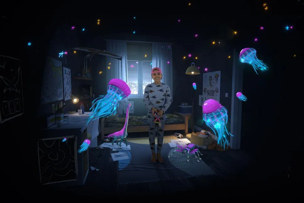 screenshot of work, showing a boy in pyjamas. In front are floating jellyfish