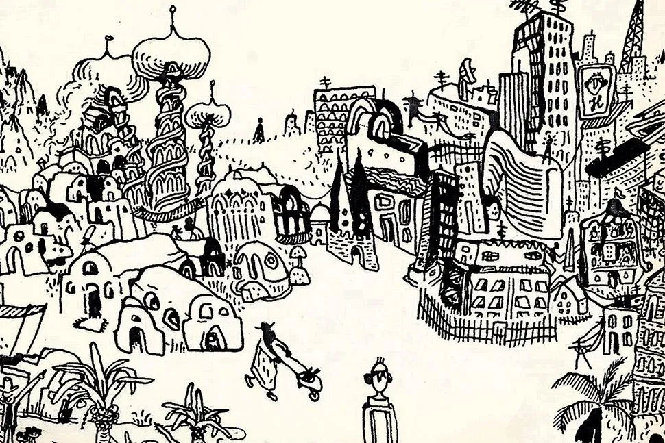 screenshot of work, showing a handdrawn illustration of a town square