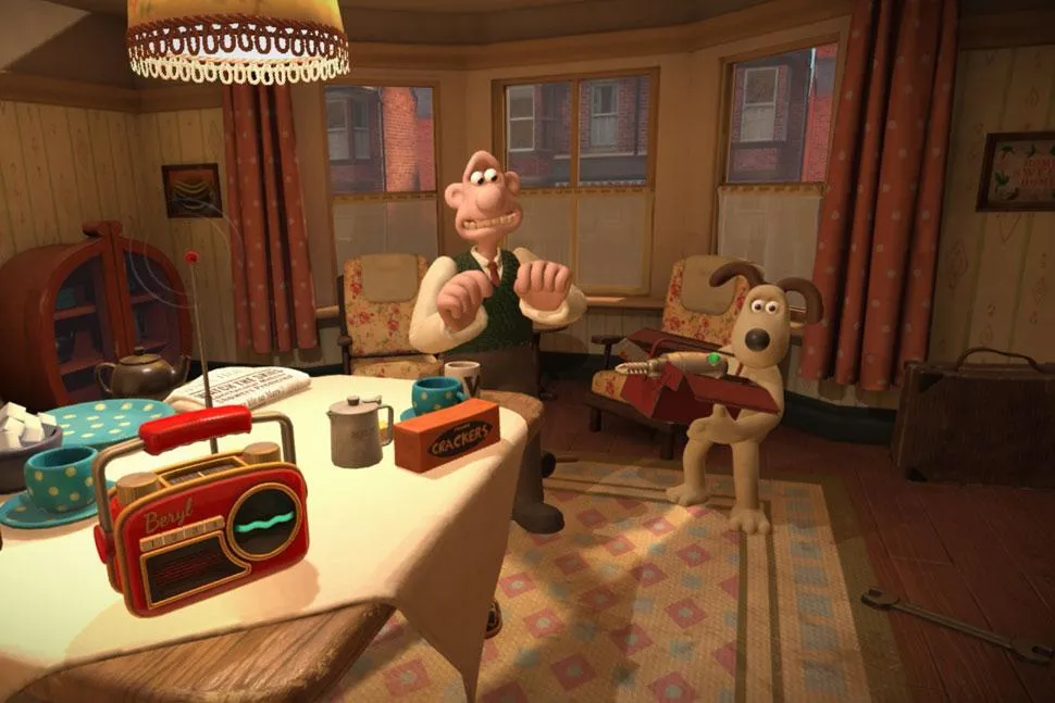 screenshot of work, showing a claymation man and dog standing in a room