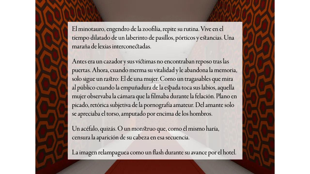 Screenshot of Hotel Minotauro — Passage of the work: black text in a white box, overlaid on an illustration of a corridor.