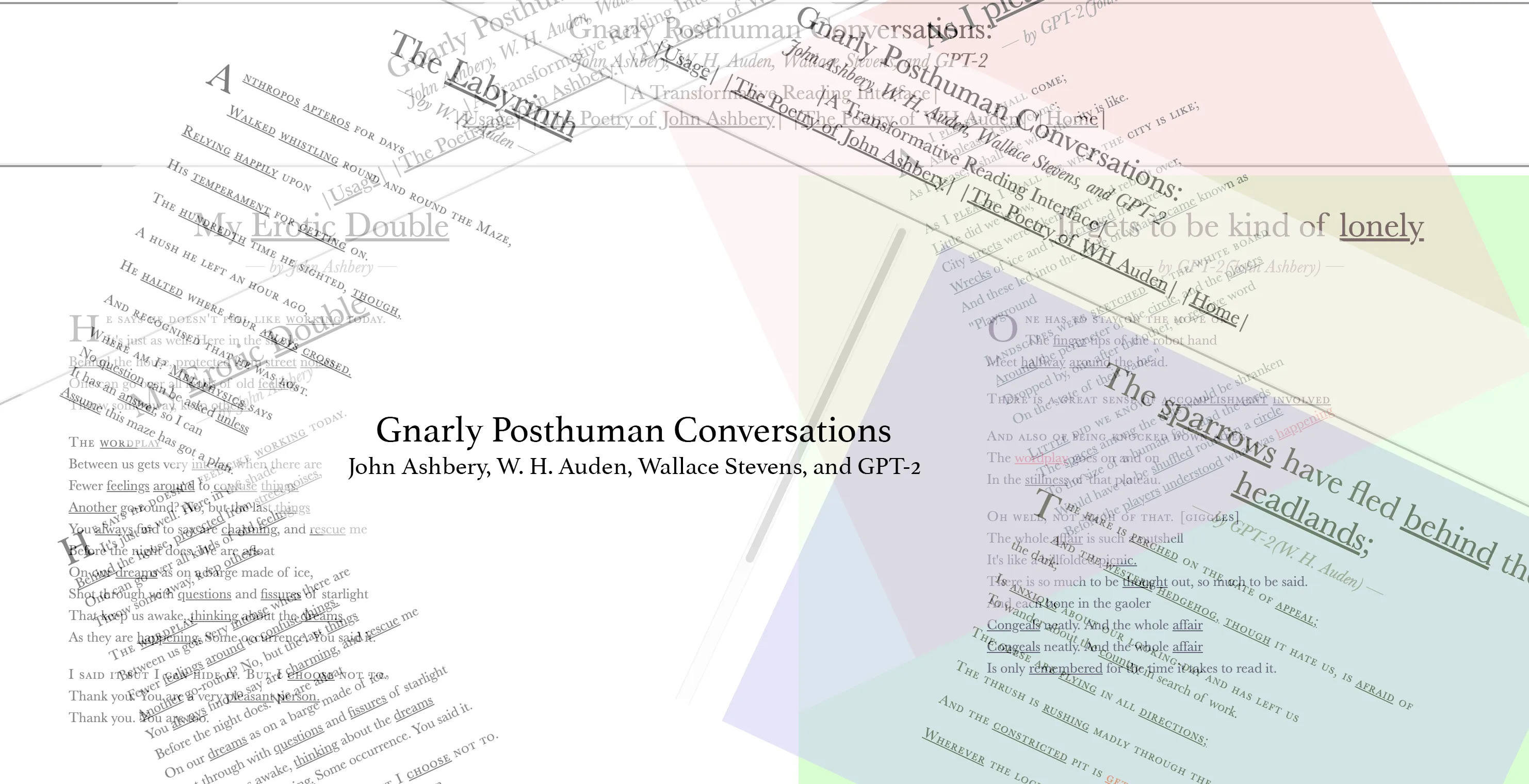 Screenshot of Gnarly Posthuman Conversations — Opening screen: Title in the center, overlaid on multiple circling transparent pages from the work.