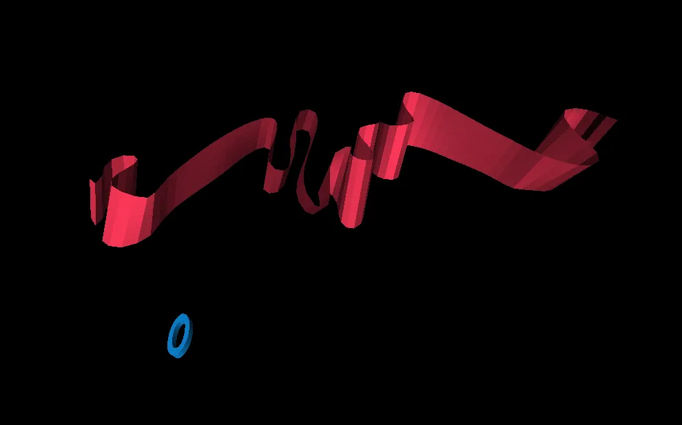 Screenshot of IO — Screenshot of IO: An 'I' depicted like a long, furling red ribbon with a small, blue 'O' beneath it.