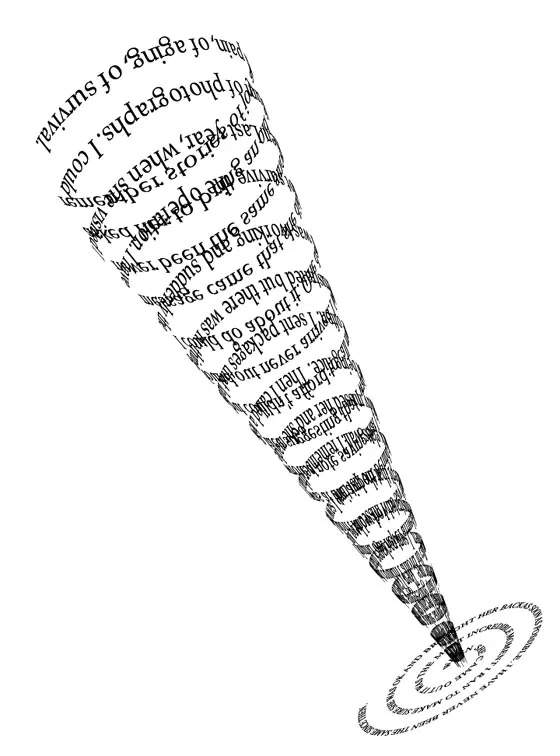 Still Image of Letter — Still of Letter: A cone, made of a spiralling text, protudes from a 2D spiral. Black text on white.