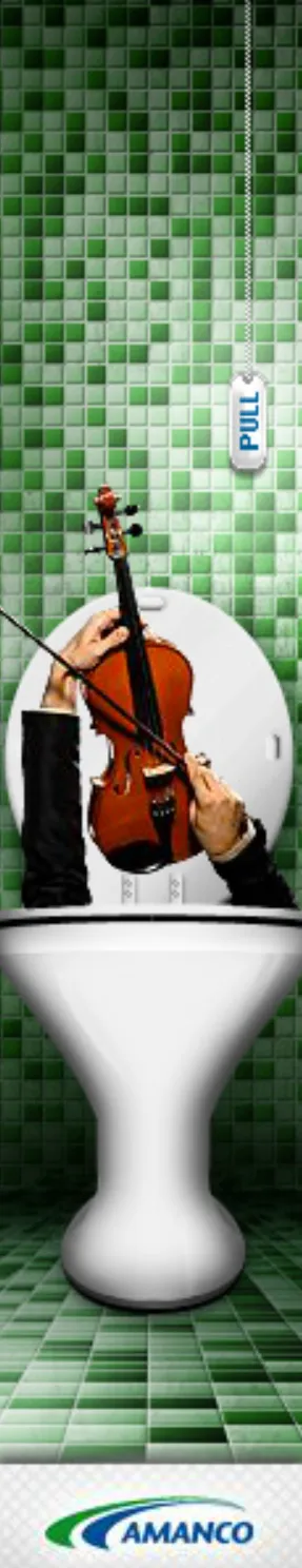 Screenshot of the Amanco Toilet banner advertisement — A vertical banner of green tiles with a toilet at bottom, with a violin and arms protuding from it.